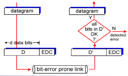 | Error Detection | EDC = Error Detection and Correction bits (redundancy) D = Data protected by error checking, may include header fields - Error detection is not 100% reliable: -> Protocol might miss some errors, but rarely -> Larger EDC field yields better detection and correction |