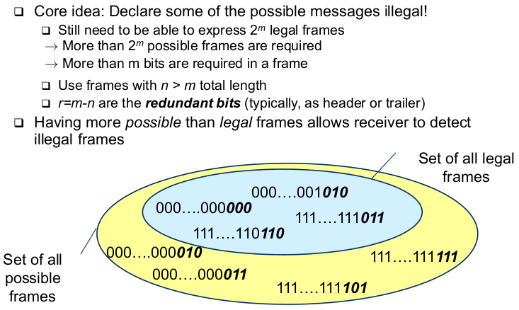 | How Do Illegal Messages Help With Detecting Bit Errors? (realizing hope) | - necessary to realize hope: -> Physical medium only alters up to a certain number of bits (by assumption) - say, k bits per frame --> This is only an assumption! -> Legal messages are sufficiently different so that it is not possible to change one legal frame into another by altering at most k bits |