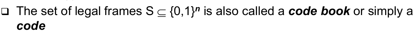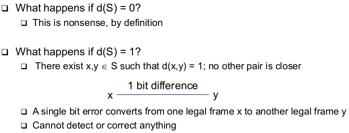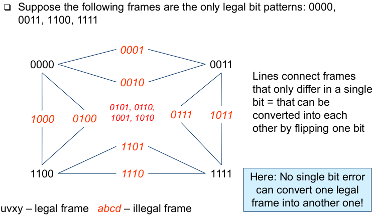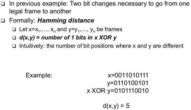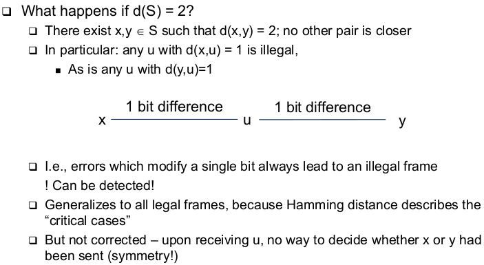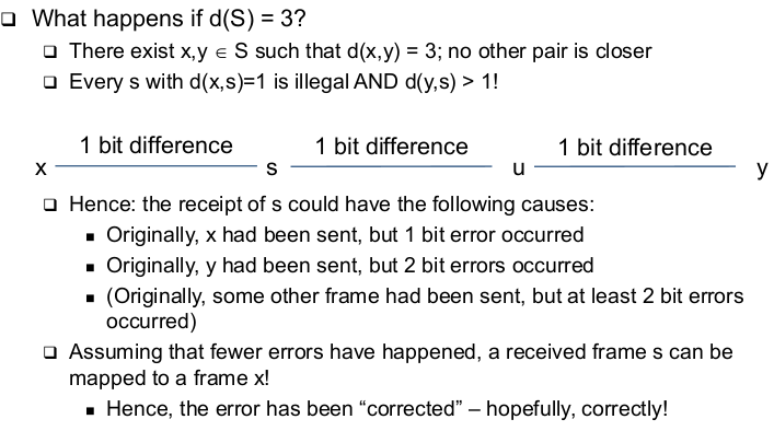 | Generalization - Required Hamming Distances (correct) | - To correct d bit errors, a Hamming distance of 2d+1 in the set of legal frames is required --> So that all frames that are at most d bits away from a legal frame are illegal and are more than d bits away from any other legal frame |
