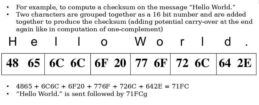 | Simple Redundancy Examples: Checksum (1) (Checksums) | - To compute a checksum, the sending computer treats the data as a sequence of binary integer and computes their sum. - Not that the Data Link Layer treats the data as a sequence of integers for the purposes of computing a checksum |