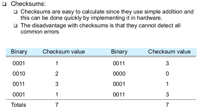 | Simple Redundancy Examples: Parity (3) (Parity bit problems + how to solve them) | - Even and odd parity works well to detect single bit errors - but it can't detect all possible errors - to detect more errors (i.e. even number of bit errors), a checksum or a cyclic redundancy check is needed |
