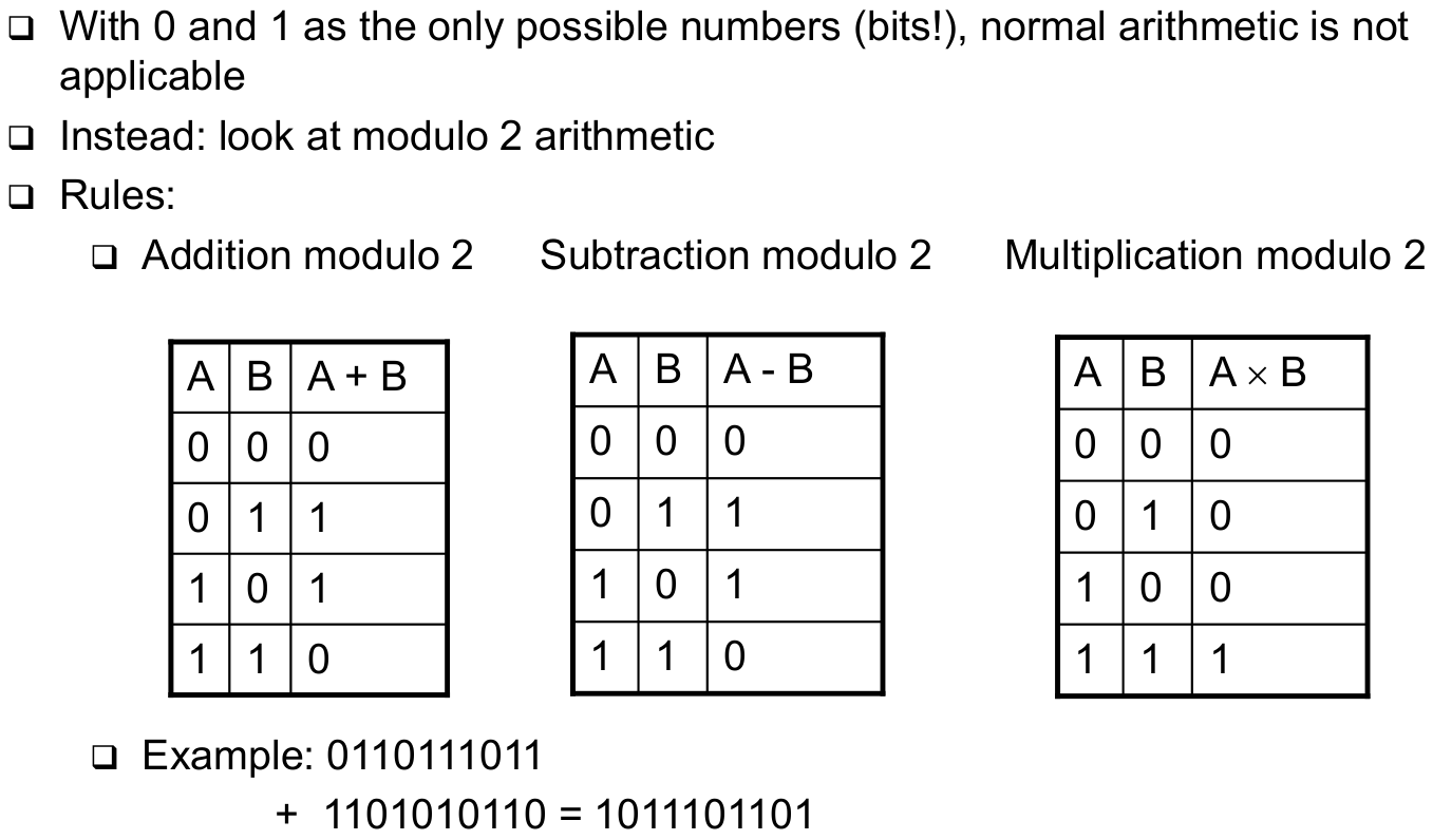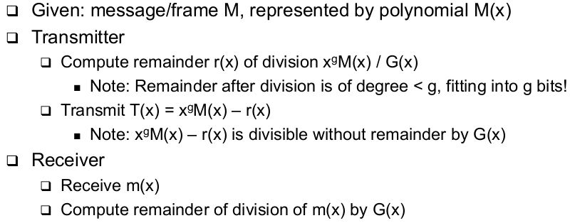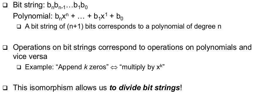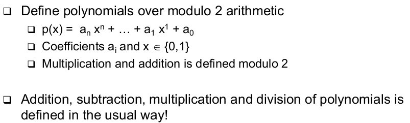 | How to Construct Error Detecting Codes - CRC (basic operation bassed on polynomial arithmetic) | - Basic operation based on polynomil arithmentic --> Bit string is interpreted as representing a polynomial --> Coefficients 0 and 1 are possible, interpreted modulo 2 |