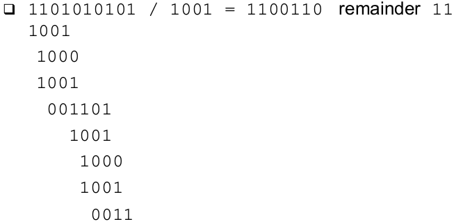 | Modulo 2 Division | - Division of two numbers is done just like normal division: --> Subtracdt the denominator (the bottom number) from the leading parts of the enumerator (the top number) --> Proceed along the enumerator until its end is reached --> Remember that we are using modulo 2 substraction - After division, a remainder may result |