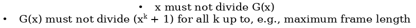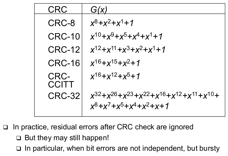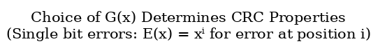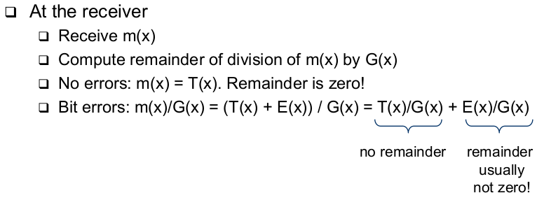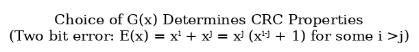 | Choice of G(x) Determines CRC Properties (When is remainder of E(x) / G(x) != 0?) | - If G(x) divides E(x) without remainder, an error slips through! |