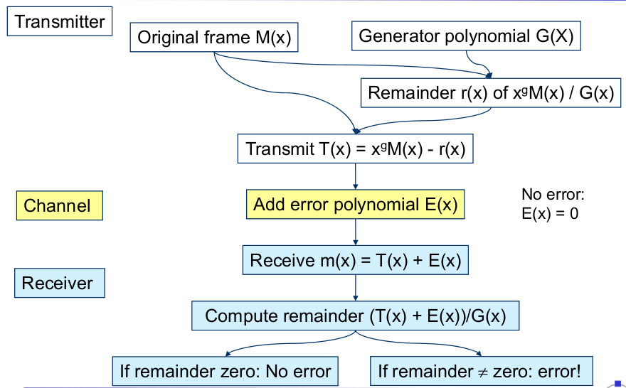 | CRC Transmission and Reception (What happens in the channel after transmitting T(x)? - Bit errors) | - Bit errors occur: T(x) is modified by flipping some bits --> Equivalent to modifying some coefficients of the polynomial --> Equivalent to adding an error polynomial E(x) --> At the receiver, T(x) + E(x) arrives |