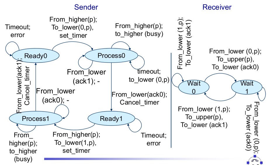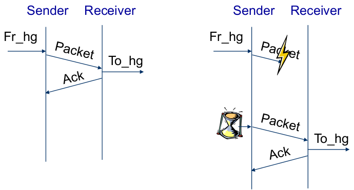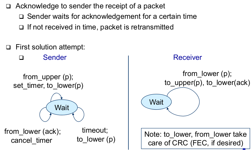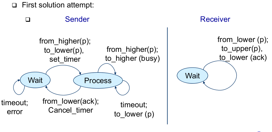 | Acknowledgment-Based Protocol, Second Trial (Cure one Problem) | - Cure one problem: Concentrate on one packet, only accept the next packet from higher layer when previous one has been fully processed |