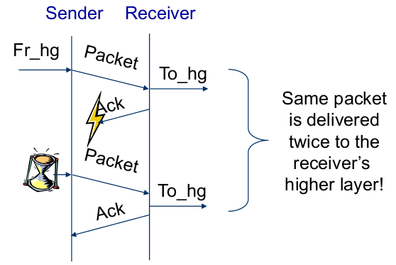 | Acknowledgement-Based Protocol, Second Trial - Does Second Version Work Correctly? (Summary of Second Version: Send and Wait) (3) | - If the ACK packet is damaged, the sender will not recognize it: -> Sender will also retransmit the packet -> Receiver gets two copies of packet |