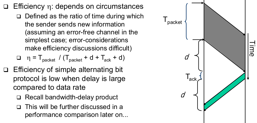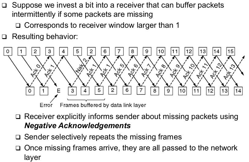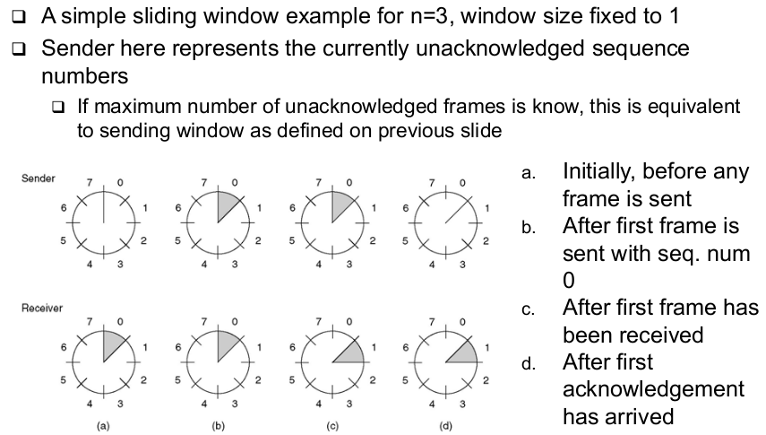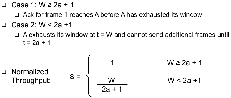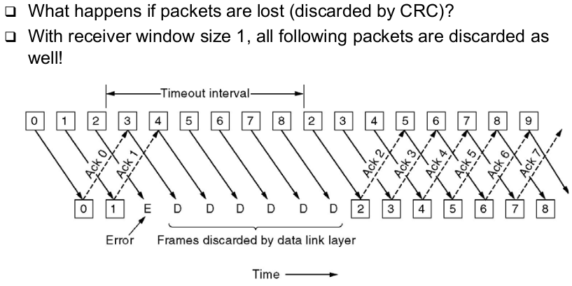 | Go-Back-N (receiver window size 1) | - With receiver window size 1, all frames following a lost frame cannot be handled by receiver -> They are out of sequence -> they cannot be acknowledged, only ACKs for the last correctly received packet can be sent |