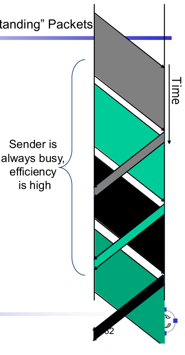 | Improving Efficiency - Have More "Outstanding" Packets (2) | - Always sending packets results in high efficiency --> More packets are "outstanding" = sent, but not yet acknowledged --> "pipelining" of packets |