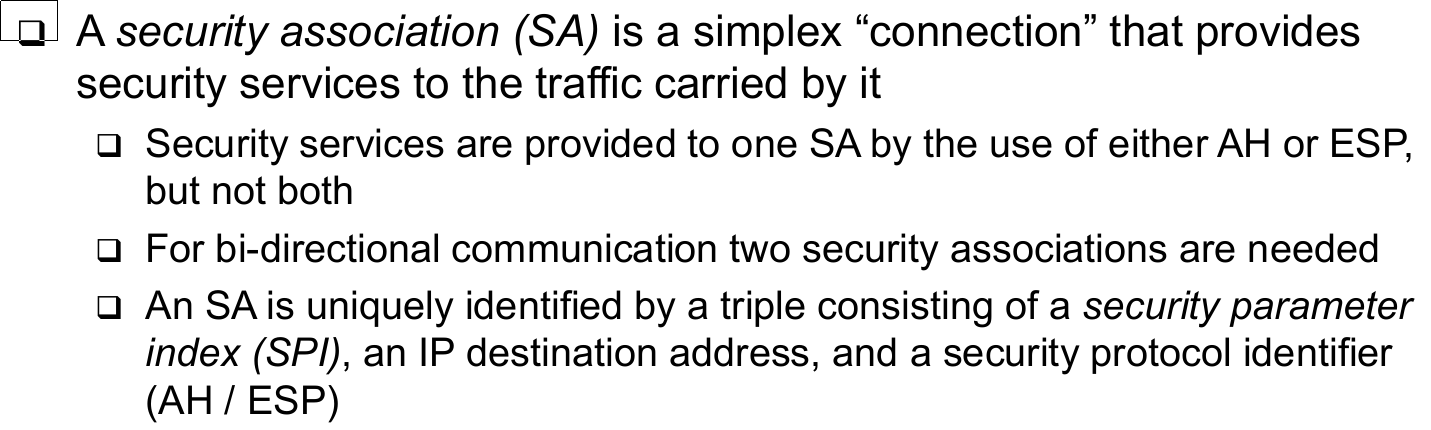 | IPSec: Security Association (There are two conceptual databases associated with SAs) | - The security policy database (SPD) specifies, what security services are to be provided to which IP packets an in what fashion - The security association database (SADB) |