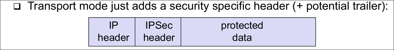 | IPSec: Protocol Modes (An AS is always of one of the following types) (Transport mode) | - Transport mode can only be used between end-points of a communication -> host <-> host or - host <-> gateway, if the gateway is a communication end-point |