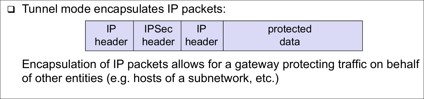 | IPSec: Protocol Modes (An AS is always of one of the following types) (Tunnel Mode) | - Tunnel mode can be used with arbitrary peers |