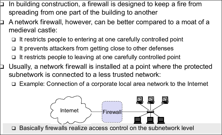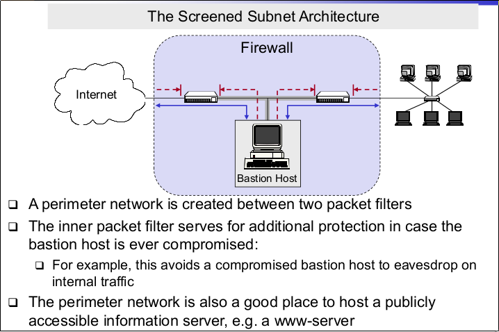 | Firewalls: Terminology (Perimeter Network) | - A subnetwork added between an external and an internal network, in order to provide an additional layer of security - A synonym for perimeter network is de-militarized zone (DMZ) |