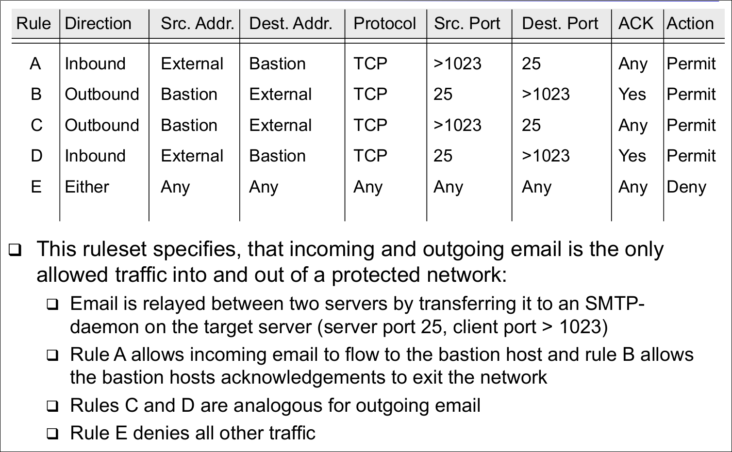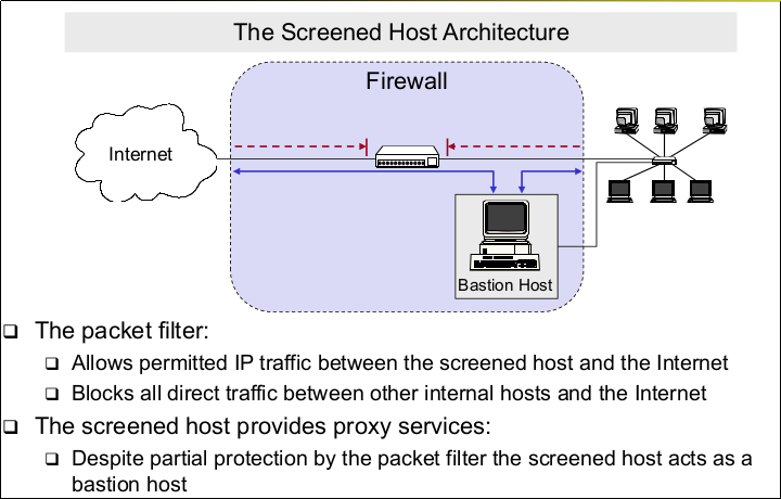 | Firewalls: Terminology (Bastion Host) | - A computer that must be highly secured because it is more vulnerable to attacks than other hosts on a subnetwork - A bastion host in a firewall is usually the main point of contact for user processes of hosts of internal networks with processes of external hosts |