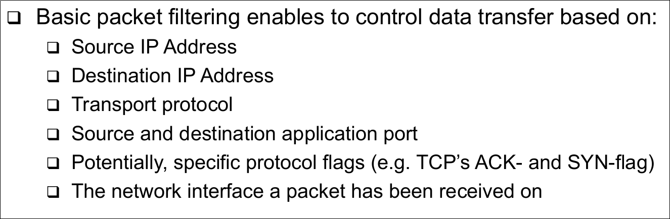 | Firewalls: Packet Filtering (Basic packet filtering enables to control data transfer on) | |