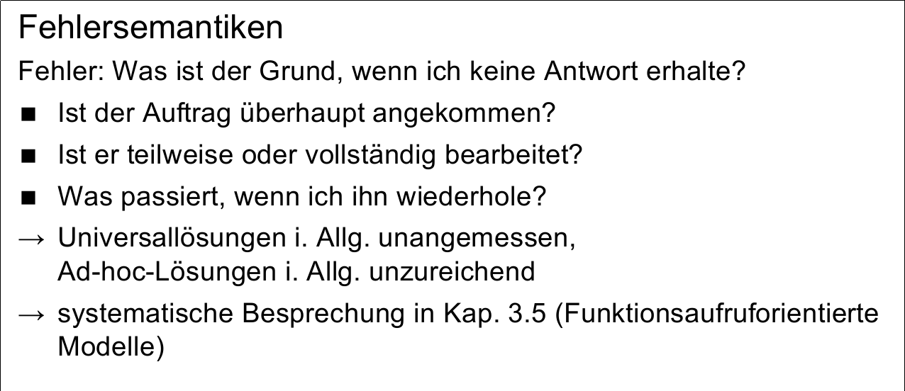 | Funktionsorientierte Modelle (Fehlersemantiken funktionsaufruforierntierter Modelle) (Fehlersemantik) (4 verbreitete Fehlersemantiken) | - "maybe" -> Garantien : keine; "nichts genaues weiß man nicht" -> Vorteil: einfache und performante Implementierung - "exactly-once" - "at-least-once" - "at-most-once" |