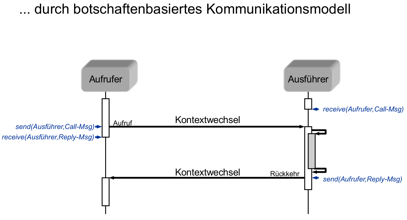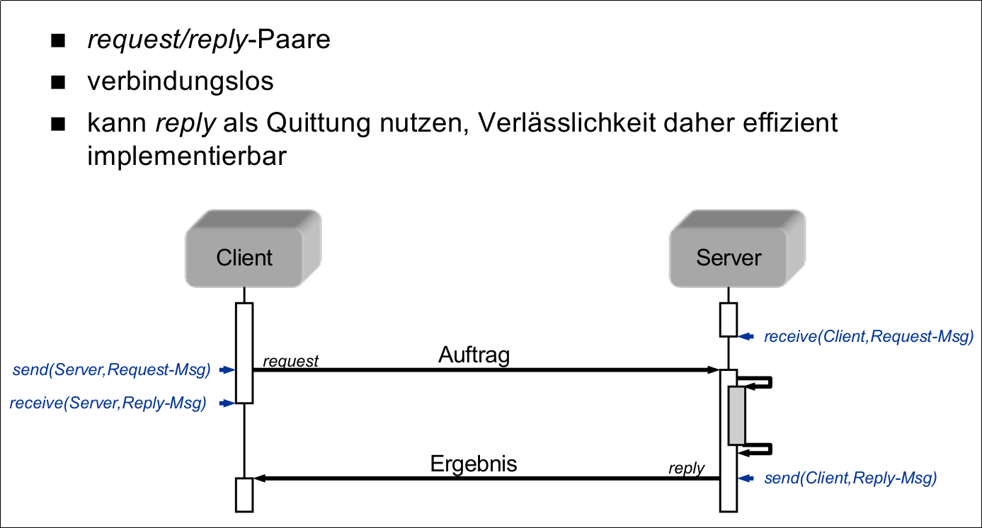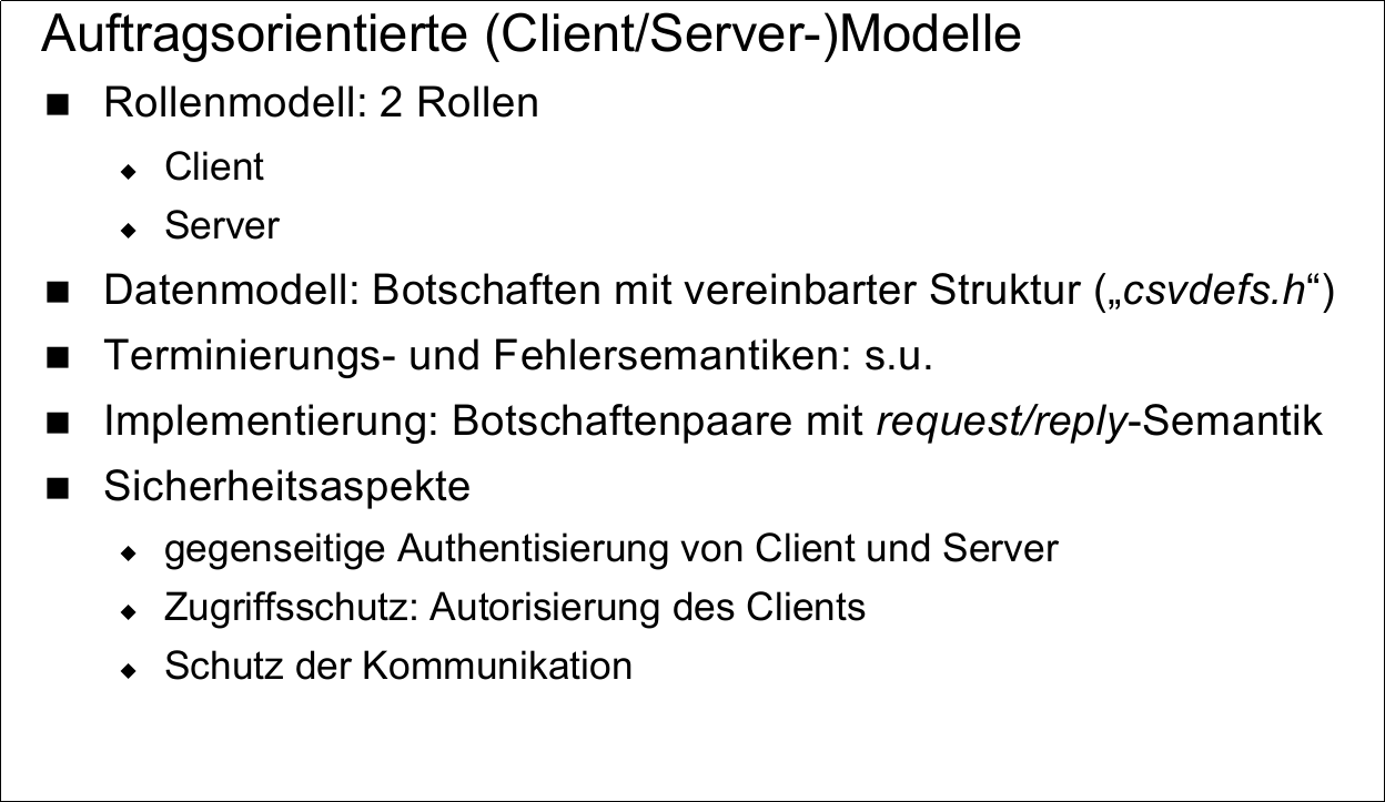 | Auftragsorientierte Modelle (Das Client/Server-Modell) (Implementierung) | - aufbauend auf elementaren send/receive-Operationen - Auftragserteilung -> send/receive-Botschaftenpaar - request/awaitresult-Semantik - Auftragsannahme -> receive/send-Botschaftenpaar -> accept/reply-Semantik |