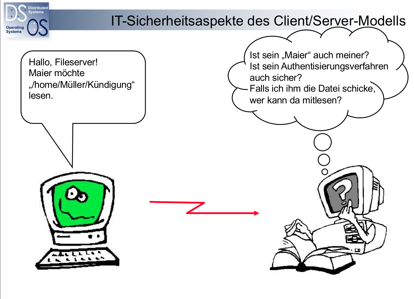 | Auftragsorientierte Modelle (Das Client/Server-Modell) (IT-Sicherheitsaspekte des Client/Server-Modells) (Vertraulichkeit, Integrität, Verfügbarkeit der Informationen) | - Client muss wissen: Wer ist der Server? => Server-Authentisierung - Kommunikation -> Mithören durch Dritter - Verändern, Verhindern der Kommunikation => Kryptografische Mechanismen |