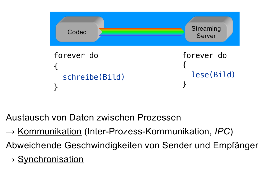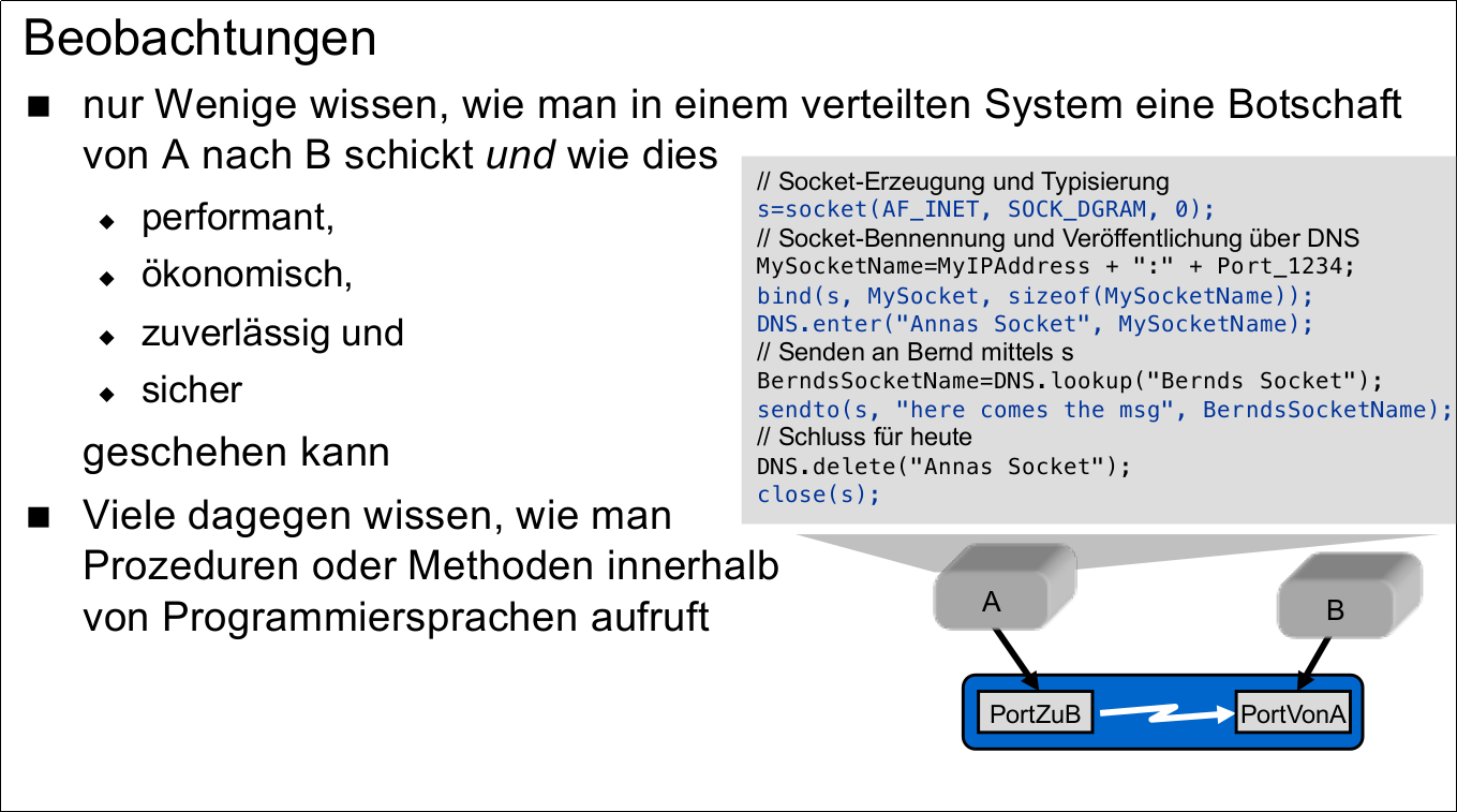 | Funktionsaufruforientierte Modelle (Für eine RPC-Implementierung können wir das darauf lernen) (allerdings noch nicht mit...) | - unterschiedlichen Adressräumen (wir haben i. Allg. keinen gemeinsamen Speicher) - unterschiedlichen Prozessen (Ablaufsteuerung) |