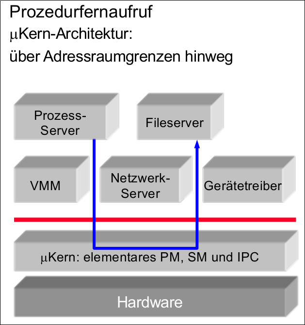 | Funktionsaufruforientierte Modelle (Beispiel 1) (Betriebssystem mit μKern-Architektur) (Grundidee dieser Architekturform) (lediglich elementarste Betriebssystem-Funktionen) | - Privilegienmanagement - Isolation (Adressräume) - IPC (RPC) |