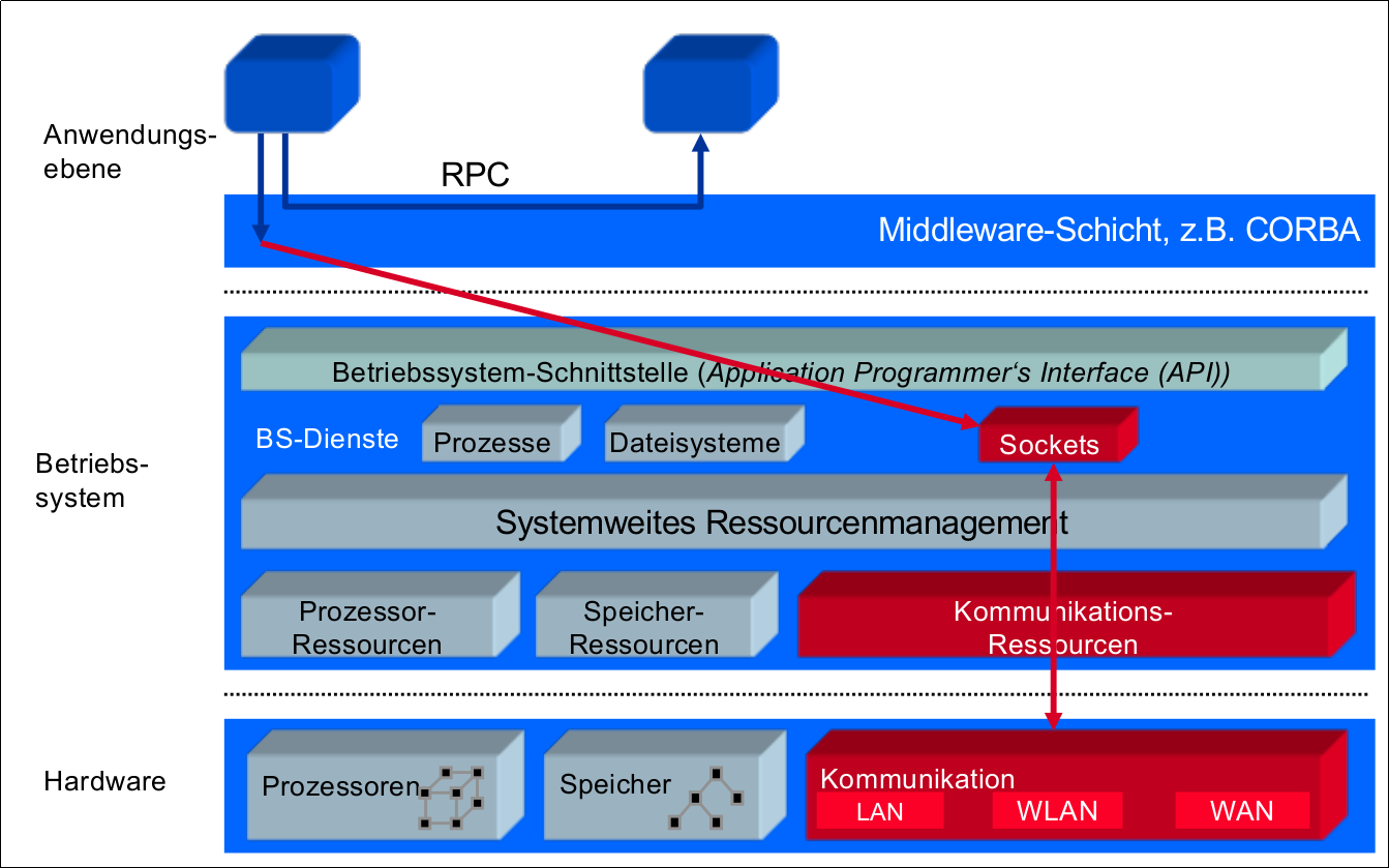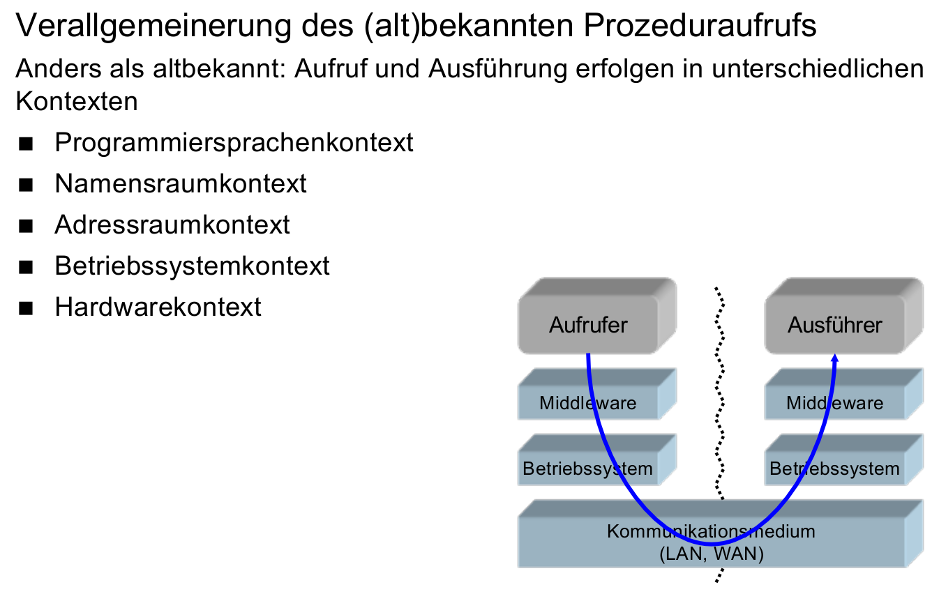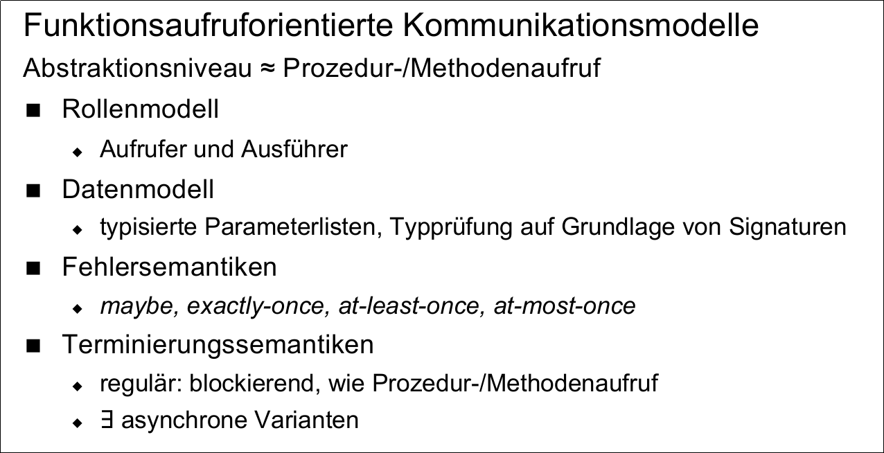 | Funktionsaufruforientierte Modelle (Idee funktionsaufruforientierter Modelle) | Adaption des - anwendungsnahen, unkomplizierten und vor Allem - vertrauten Kommunikationsparadigmas an die Eigenschaften verteilter Systeme |