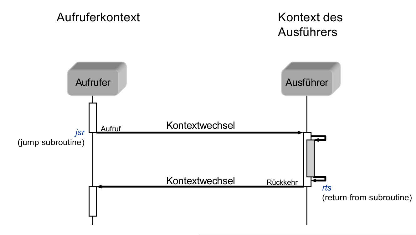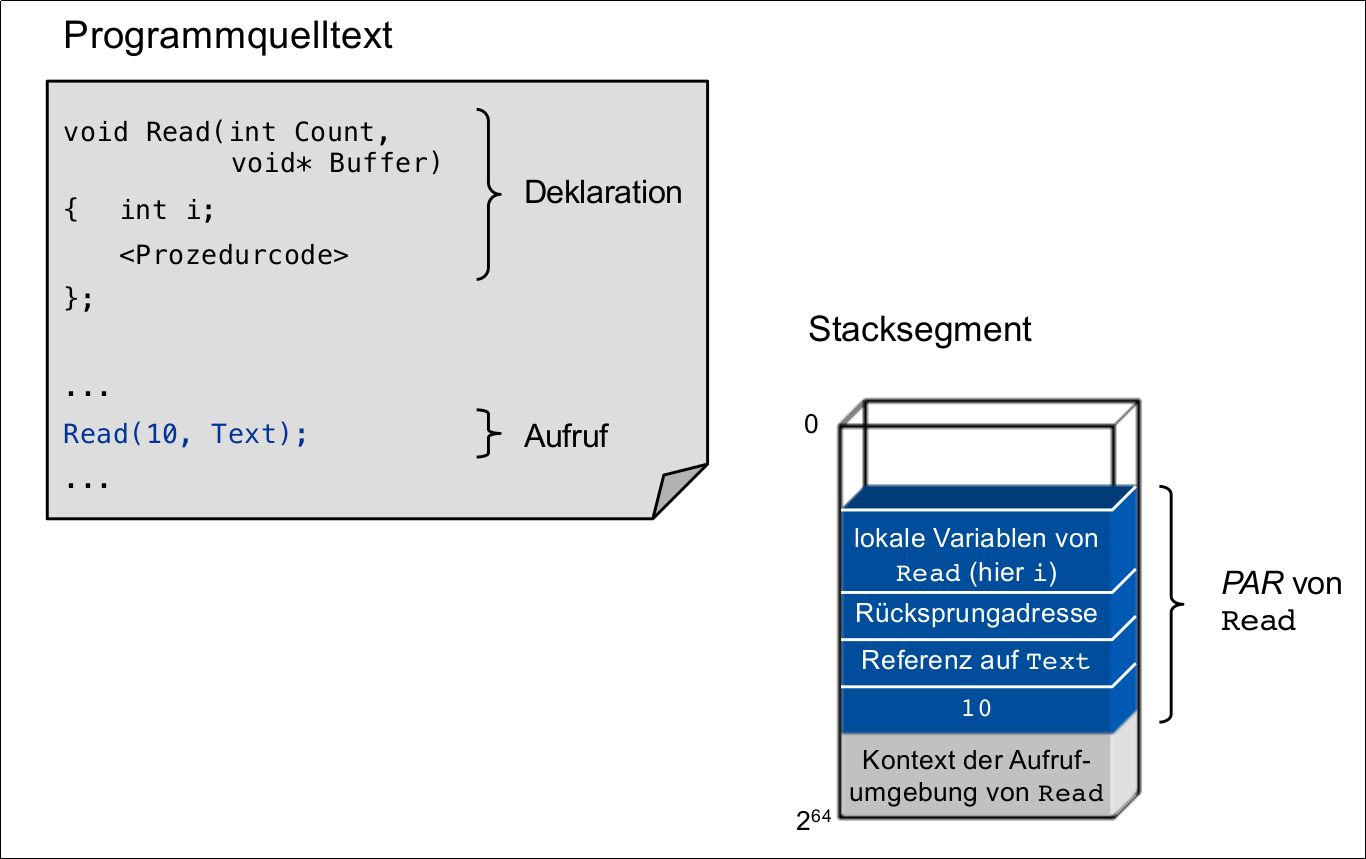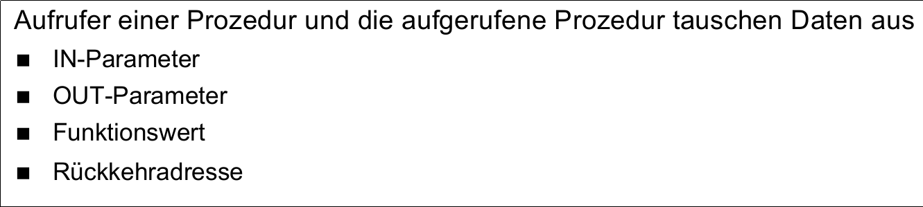 | Funktionsaufruforientierte Modelle (Quintessenz - \end{Ausflug}) (Anmerkung) | - PARs werden oft auch in Prozessorregistern (statt Stack) übergeben -> schneller -> ebenfalls vom Aufrufer und Ausführer gemeinsam genutzt |