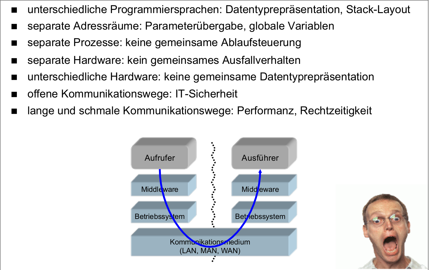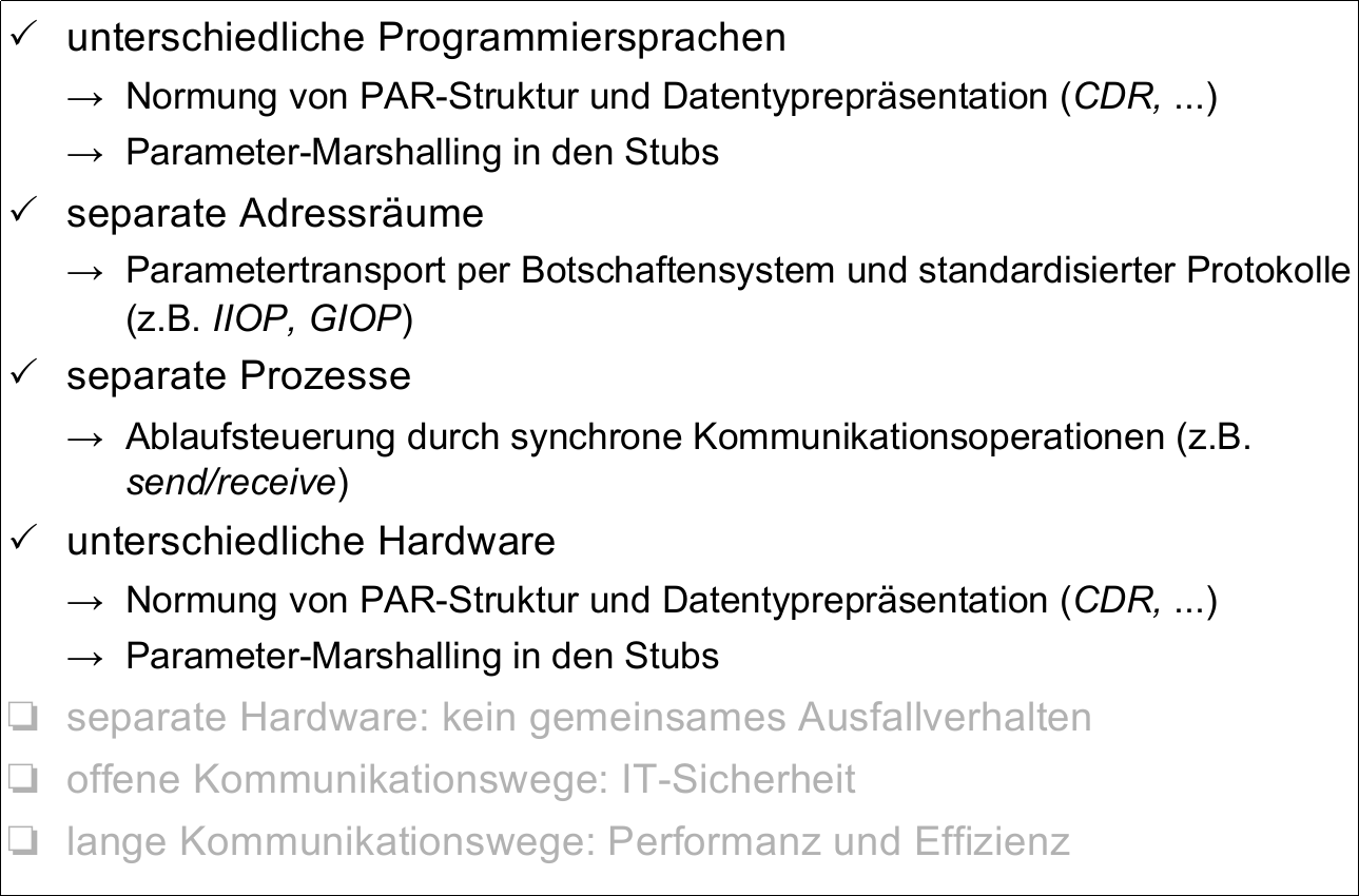| Funktionsaufruforientierte Modelle (Die 7 Plagen verteilter Systeme) (Plage 4) | - Separate Hardware => Ausfälle (unabhängig voneinander!) werden sichtbar -> des Kommunikationsmediums -> des Aufrufers -> des Ausführers |