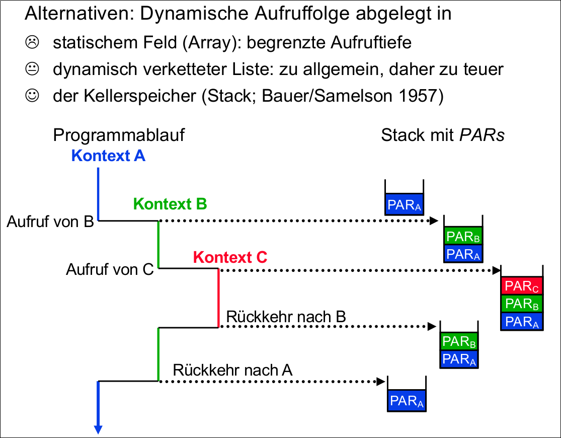| Funktionsaufruforientierte Modelle (\begin{Ausflug}) (Compiler-Techniken) (Ein Problem prozeduraler Programmiersprachen) | Aufruf einer Prozedur erzeugt neuen Kontext - an den IN-Parameter von der Aufrufstelle übergeben werden können - aus dem OUT-Parameter an die Aufrufstelle übergeben werden können - aus dem (in der Regel) an die Aufrufstelle zurückgekehrt wird - der prozedurale Variablen besitzt -> dynamisch -> geschachtelt -> rekursiv |