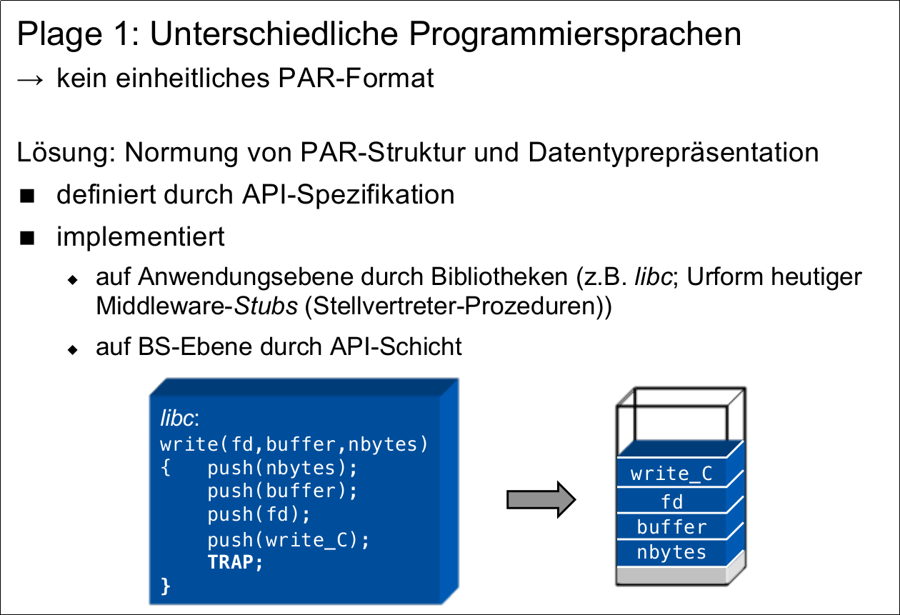 | Funktionsaufruforientierte Modelle (Die 7 Plagen verteilter Systeme) (Plage 1) | - Unterschiedliche Programmiersprachen => kein einheitlcihes PAR-Format, d.h. -> unterschiedliche Formate der PAR -> unterschiedliche Datenrepräsentation innerhalb des PAR |
