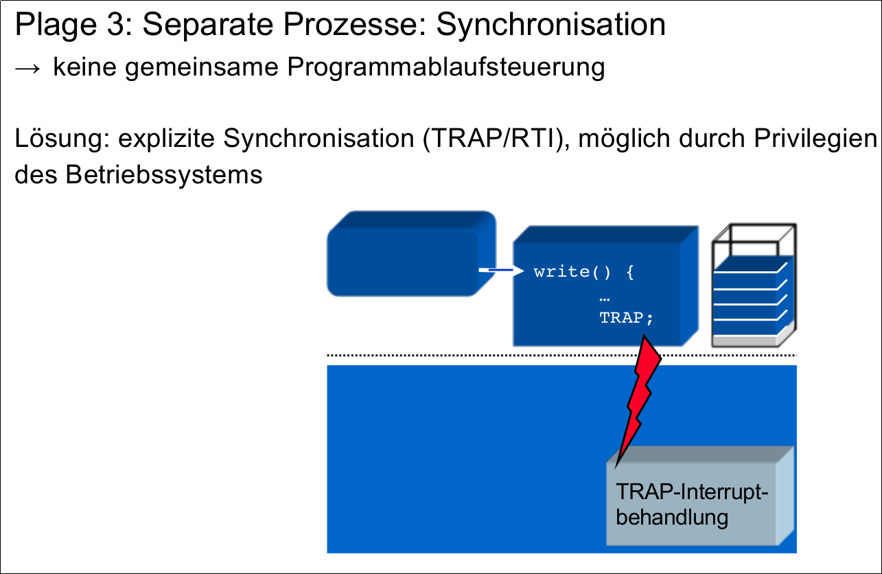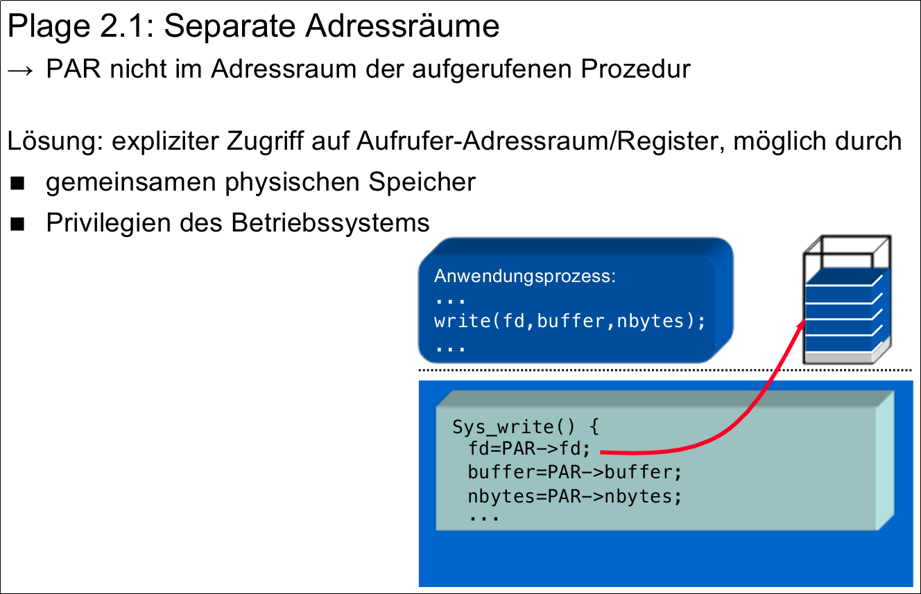 | Funktionsaufruforientierte Modelle (Ein erster Schritt) (Auf genau die ersten 3 Plagen treffen wir auch beim Aufruf von Betriebssystemdiensten) (Prozeduraufrufmodell mit...) | - unterschiedlichen Programmiersprachen (Plage 1) - (evtl.) separaten Adressräumen (Plage 2) - (evtl.) separaten Prozessen (Plage 3) |