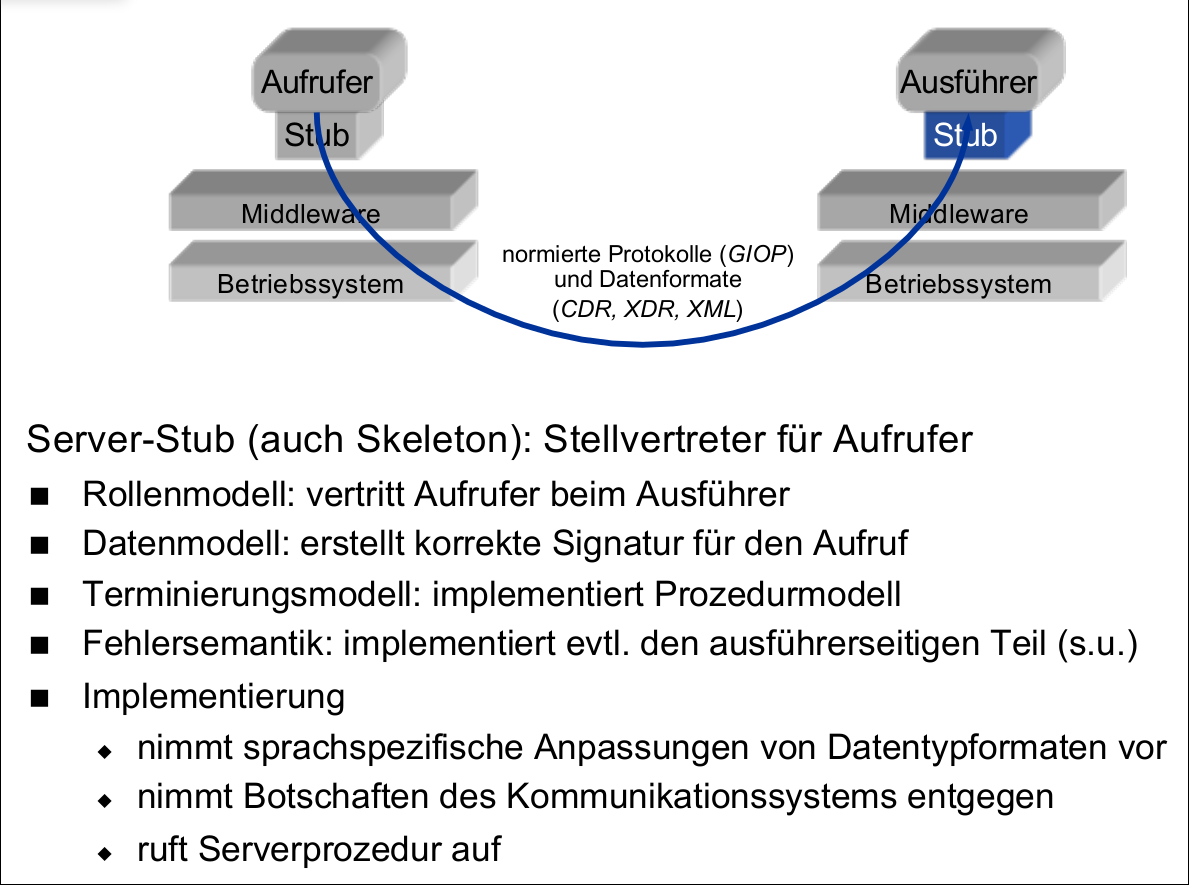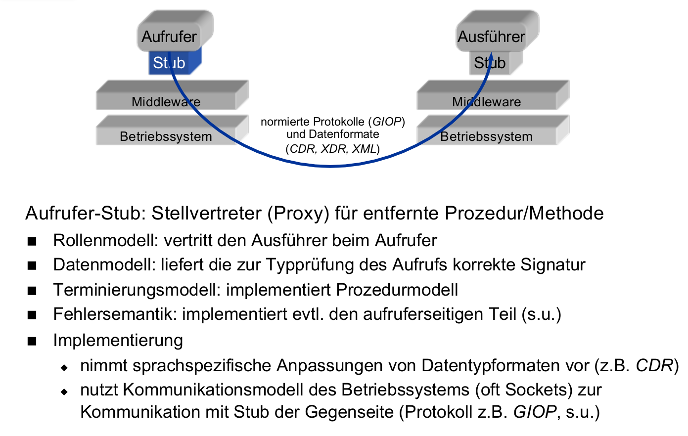 | Funktionsaufruforientierte Modelle (Stubs) (Ziel) (Fernaufrufe wie lokale Prozeduraufrufe aussehen zu lassen) (Stubs beinhalten) | - Stellvertreter der aufgerufenen Prozedur beim Aufrufer - Stellvertreter des Aufrufers auf der Ausführerseite |