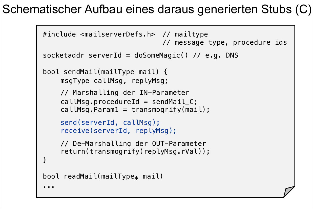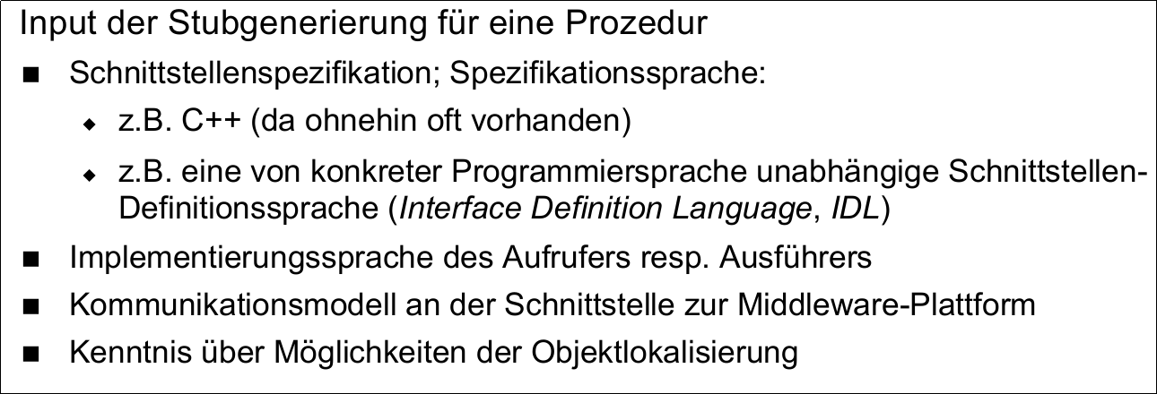 | Funktionsaufruforientierte Modelle (Wo kommen Stubs nun her?) (Aufruf von RPCs-in beliebigen verteilten Anwendungen) (Input der Stubgenerierung für eine Prozedur) | |