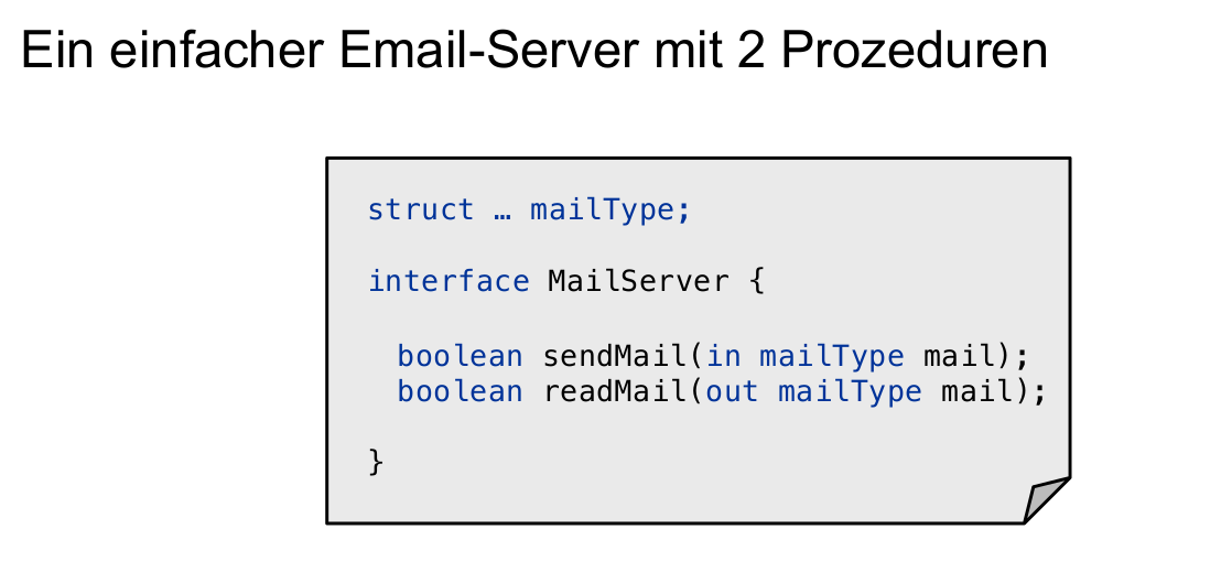 | Funktionsaufruforientierte Modelle (Beispiel einer (COBRA) IDL Schnittstellendefinition) (Ein einfacher Email-Server mit 2 Prozeduren) | |