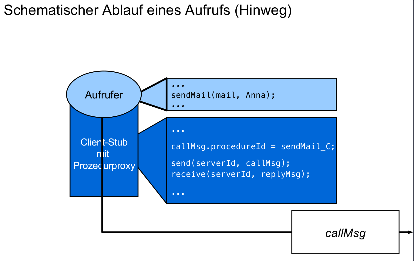 | Funktionsaufruforientierte Modelle (Stubs) (Ziel) (Fernaufrufe wie lokale Prozeduraufrufe aussehen zu lassen) (Aufruftransparenz) | - kein explizites Parameterübergabemanagement => PAR-Transport - keine explizite Programmablaufsteuerung => Synchronisation |