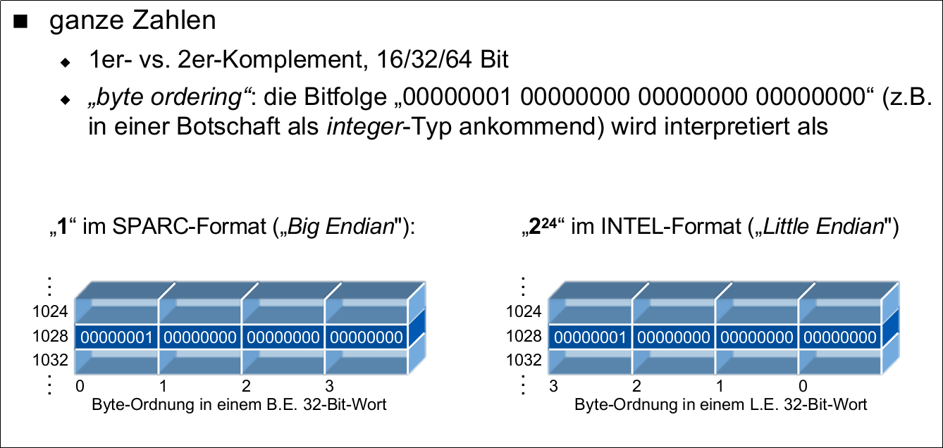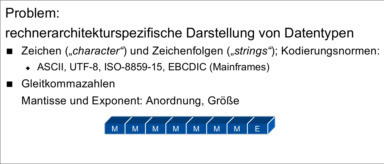 | Funktionsaufruforientierte Modelle (Die 7 Plagen verteilter Systeme) (Plage 5) | - Unterschiedliche Hardware => unterschiedliche Speicherabbildung der Datentypen im PAR -> ganze und rationale Zahlen -> Zeichencodierung |