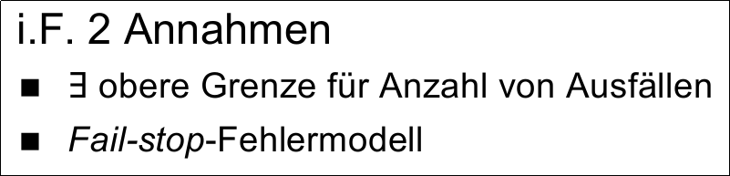 | Funktionsorientierte Modelle (Partielle Ausfälle) (Fehlermodelle) (Fail-stop-Fehler (auch fail-silent)) | - Knoten: ausgefallene Knoten stoppen und schweigen für immer - Kommunikation: Botschaften gehen vollständig verloren |