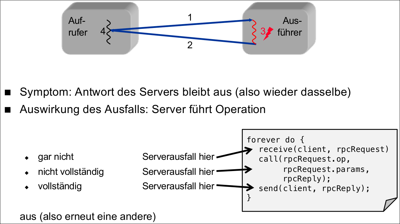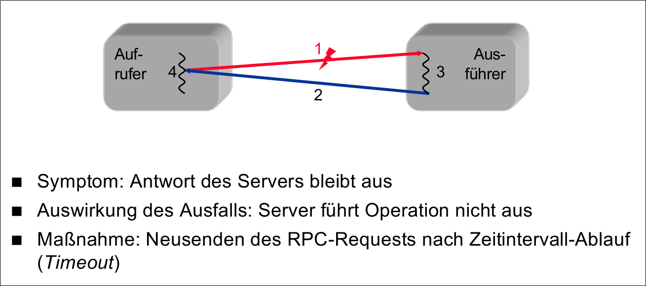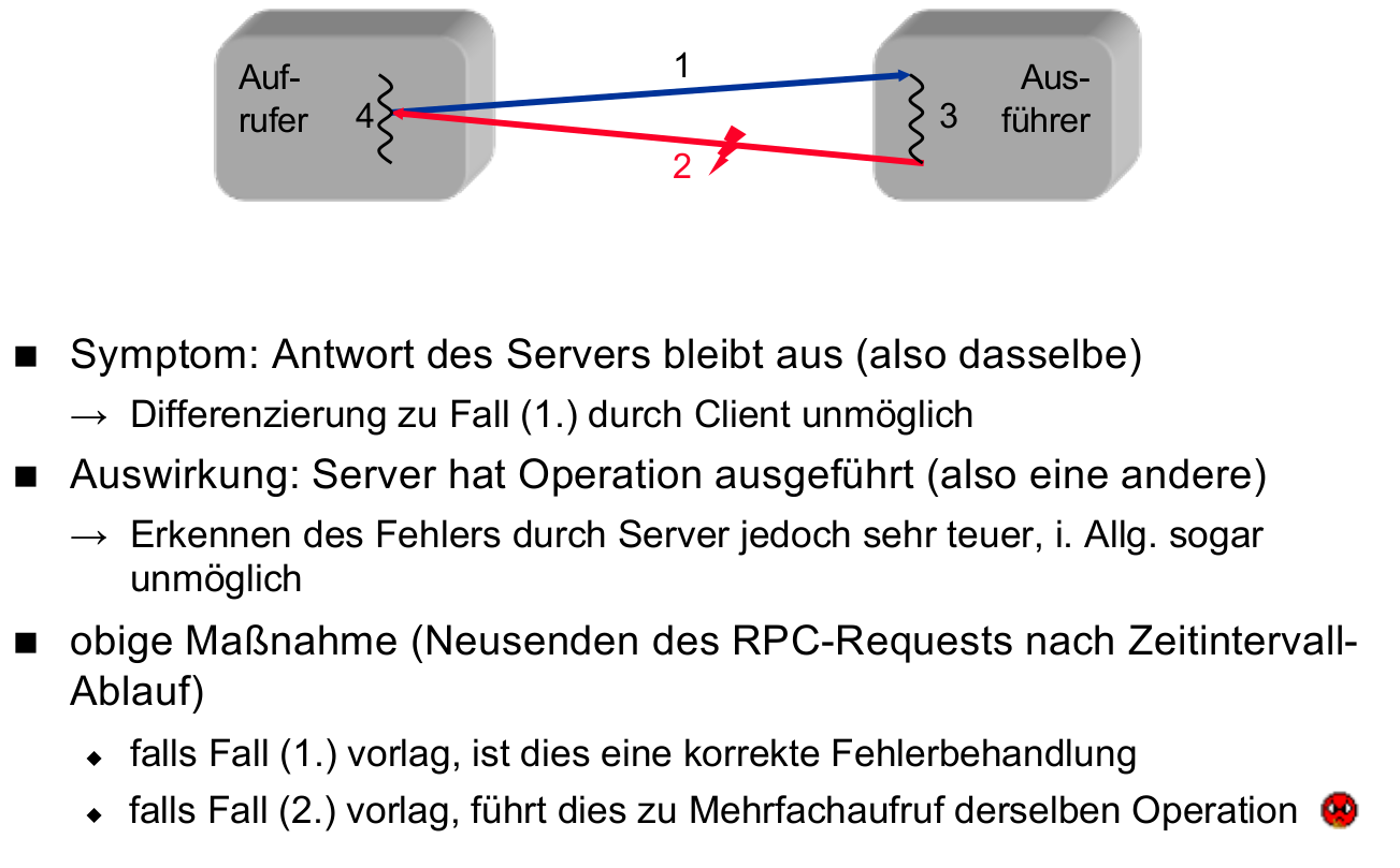 | Funktionsorientierte Modelle (2. Verlust von RPC-Replies) (Symptom) | - Symptom: Antwort des Servers bleibt aus (also dasselbe) => Differenzierung zu Fall (1.) durch Client unmöglich |