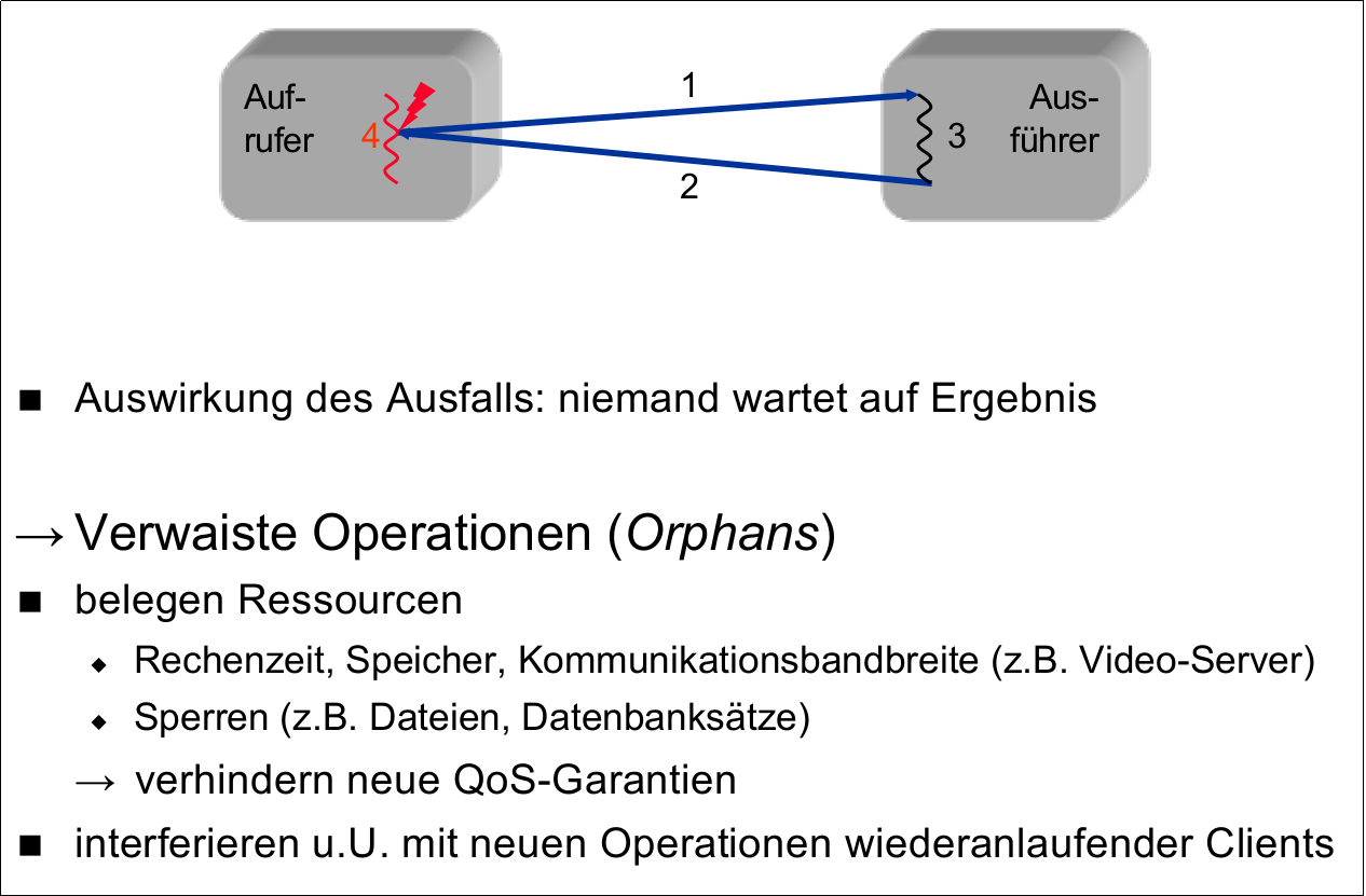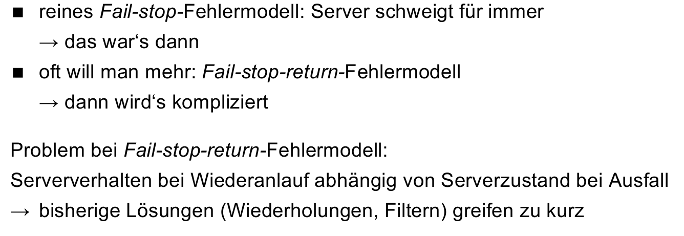 | Funktionsorientierte Modelle (2. Verlust von RPC-Replies) (Auswirkung) | - Auswirkung: Server hat Operation ausgeführt (also eine andere) => Erkennen des Fehlers durch Server jedoch sehr teuer, i. Allg. sogar unmöglich |