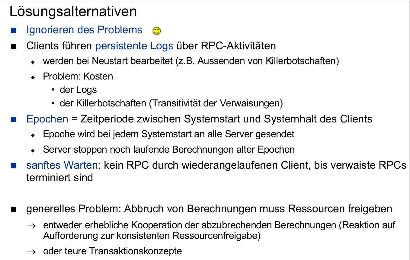 | Funktionsorientierte Modelle (2. Verlust von RPC-Replies) (Lösungen) (1. Idempotente Serveroperationen) (Beispiele) | - Lesen eines Bankkontostandes - Erteilen punktueller Weckaufträge - Löschen von Dateien |