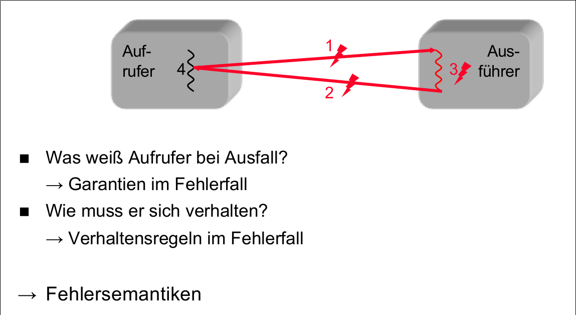 | Funktionsorientierte Modelle (Fehlersemantiken funktionsaufruforierntierter Modelle) (Fehlersemantik) | - Spezifikation der Garantien, die einem Aufrufer über die Ausführung der Prozedur auch unter möglichen partiellen Ausfällen gegeben werden => Daraus dann abgeleitet: das Verhalten beider Seiten |
