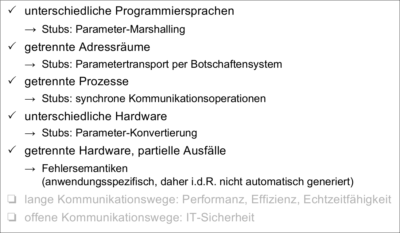 | Funktionsorientierte Modelle (LPC = RPC? => Stubs) (Orts- und Zugriffstransparenz) :) | - Adressierung und Lokalisierung - Aufrufsyntax: Parametermarshalling |