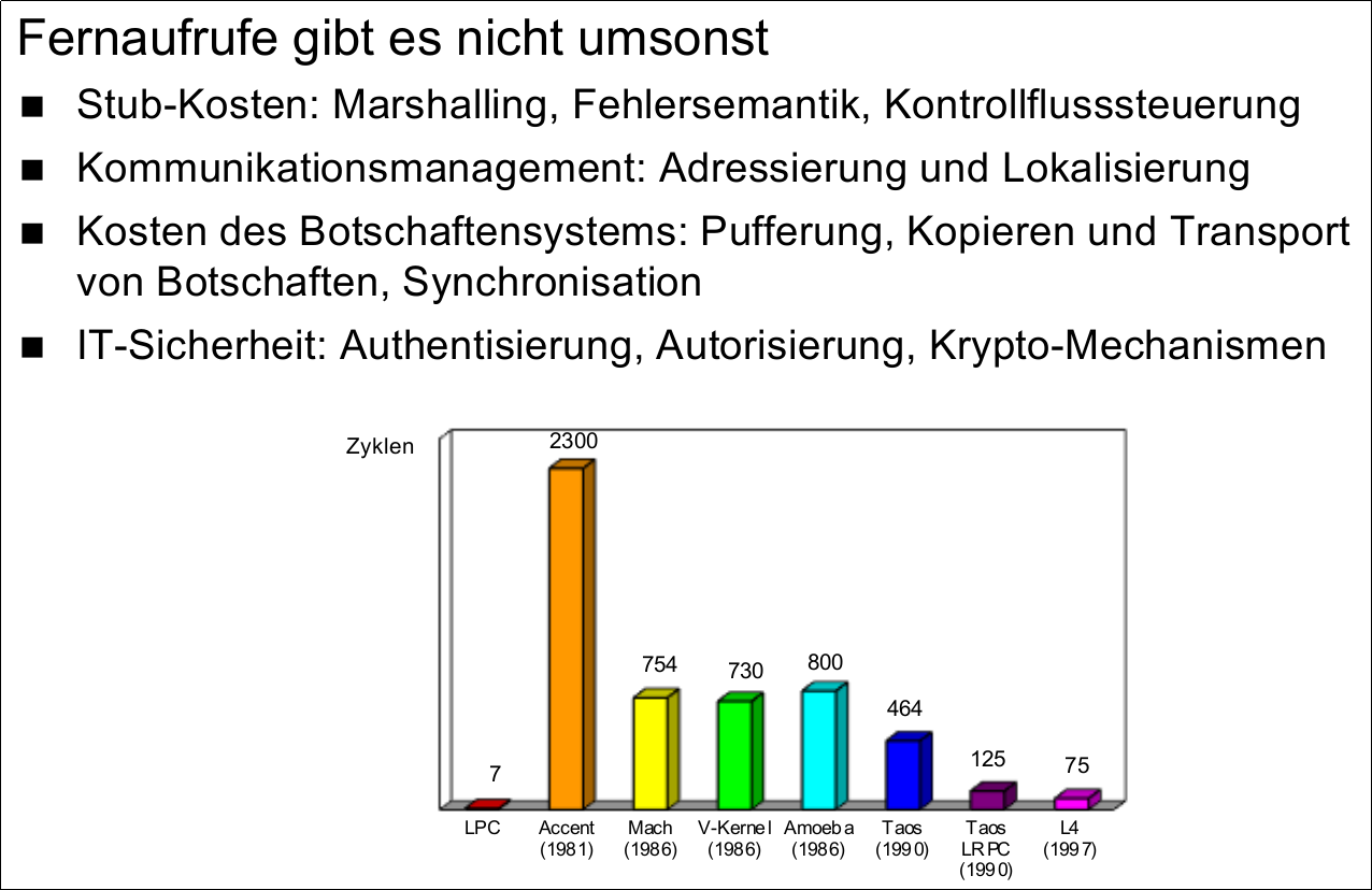 | Funktionsaufruforientierte Modelle (Beispiel 1) (Betriebssystem mit μKern-Architektur) (Grundidee dieser Architekturform) | => Robustheit => Sicherheit => funktionale Skalierbarkeit |