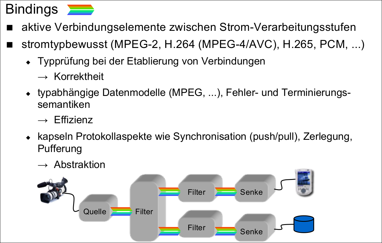 | Strombasierte Modelle (Datenmodell) (Fehler- und Terminierungssemantiken) (Beispiel: Reaktion auf Datenverlust/Verfälschung) (reparierbar?) | - Echtzeitbedingungen: ausreichend Zeit? - Nutzbare Redundanz? - Puffert Sender? - Wichtigkeit der Verluste (z.B. I-Frame vs. B-Frame) |