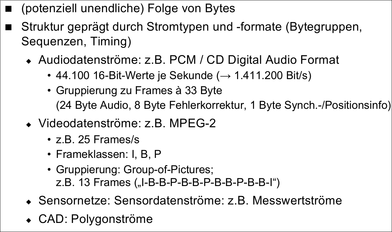 | Strombasierte Modelle (Datenmodell) (Fehler- und Terminierungssemantiken) (Beispiel: Reaktion auf Datenverlust/Verfälschung) (gegeben Garantien? Verlust tolerierbar?) | - medizinische Anwendungen: nein - digitales Fernsehen: ja |
