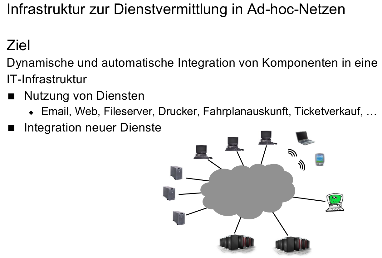 | Wissensbasierte Modelle (Anwendungsbeispiel: Die Jini-Infrastruktur (Java Intelligent Network Infrastructure) (Die Idee) (Jeder Dienst) | - besitzt eine Dienstbeschreibung: Java-Klasse - besitzt eine Bedienungsanleitung: Java-Klasse - ist bei einem Dienstbroker registriert |