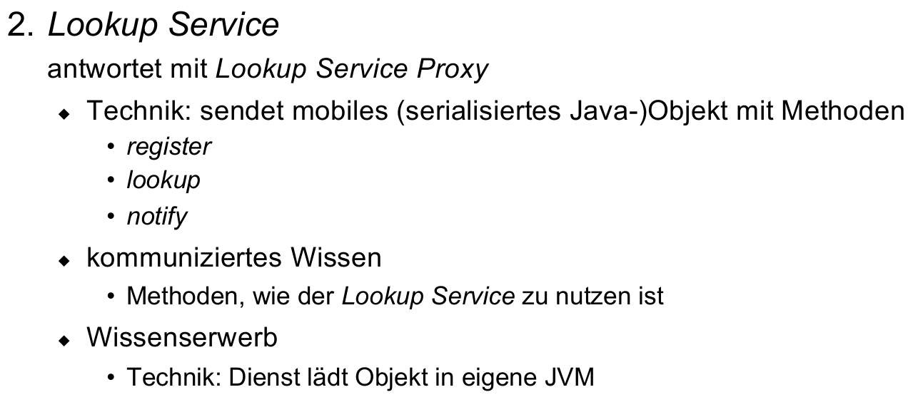 | Wissensbasierte Modelle (Finden von Diensten) (4. Lookup Service) | - sendet an client passende Service-Item-Objekte -> Technik: Dienstproxies mit Methoden zum Nutzen des Dienstes -> Kommuniziertes Wissen --> Methoden, wie Dienste nu nutzen sind |