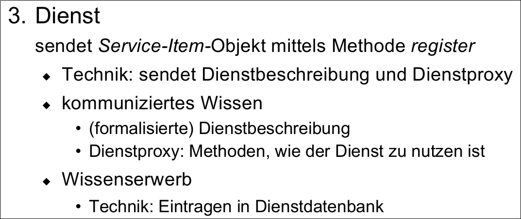 | Wissensbasierte Modelle (Anwendungsbeispiel: Die Jini-Infrastruktur (Java Intelligent Network Infrastructure) (Registrierung von Diensten) (3. Dienst) | |