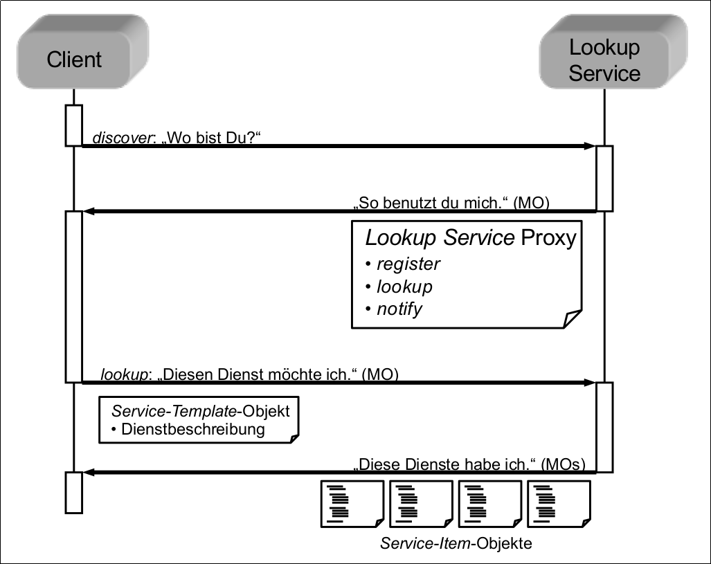 | Wissensbasierte Modelle (Anwendungsbeispiel: Die Jini-Infrastruktur (Java Intelligent Network Infrastructure) (Zusammenfassung Jini) (Durch mobile Objekte kommuniziertes Wissen) | - Lookup Service Proxy: Methoden zur Nutzung des Lookup Service - Service-Item-Objekte: Beschreibungen und Methoden zur Nutzung von Diensten - Service-Template-Objekte: Beschreibungen von Diensten |