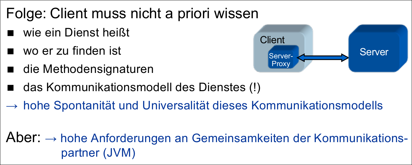 | Wissensbasierte Modelle (Anwendungsbeispiel: Die Jini-Infrastruktur (Java Intelligent Network Infrastructure) (Finden von Diensten) (Anmerkung) | - Im Unterschied zum Client/Server-Modell ist das Kommunikationsmodell zwischen Dienst und Client komplett in der Hand des Proxies |