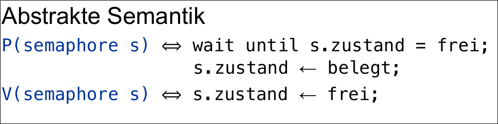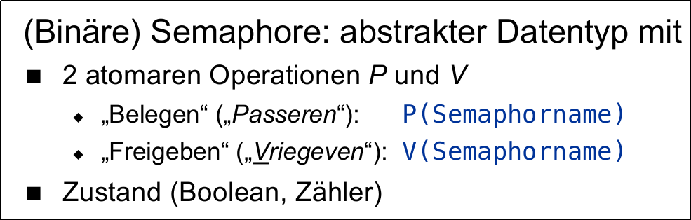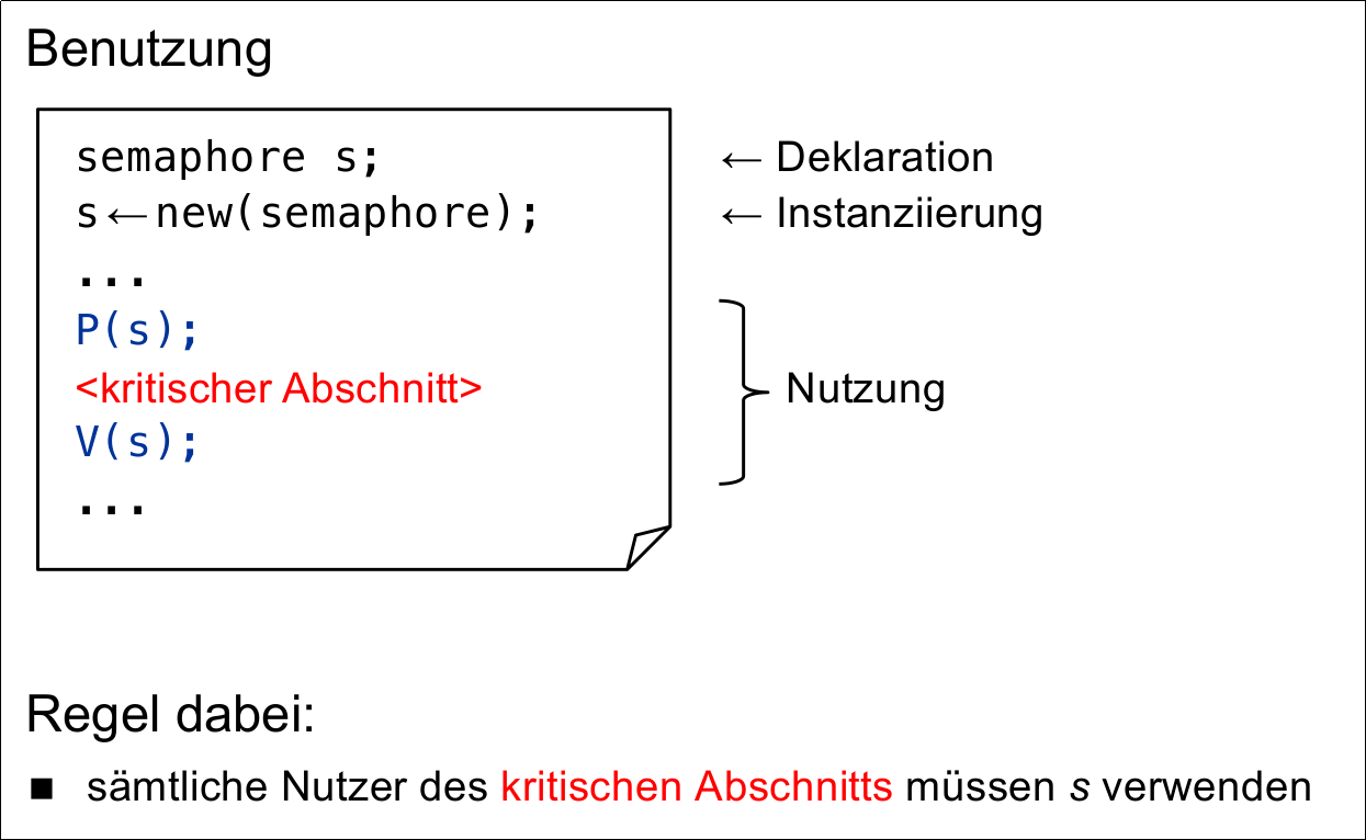 | Wissensbasierte Modelle (Transaktionaler Speicher) (Benutzung von Semaphoren) (Ausflugsende - Zwischenfazit) (Semaphore) | - lösen 2 elementare Synchronisationsprobleme paralleler Aktivitäten -> wechselseitiger Ausschluss - unterschiedliche Geschwindigkeiten - erreichen dies durch aktives Warten oder Suspendierung - sind implementiert in den Tiefen des Ressourcenmanagements |